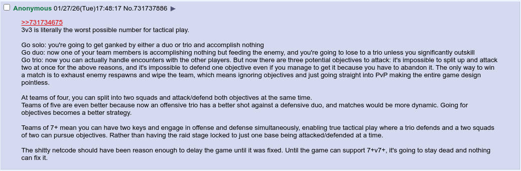 >>732174493Apparently, Highguard originally had 8v8 battles, but the playtesters discovered that each match lasted over two hours, so it was cut down to 3v3.Source: random YouTube comment.