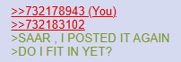 >>732178943>>732183102>SAAR , I POSTED IT AGAIN>DO I FIT IN YET?