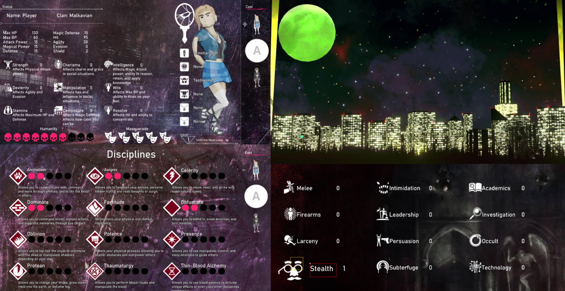 I've been heads down and working on my VTM fangame while reading these threads, still need to pick a name for this game, create a studio LLC, and submit to VTM Unbound. Progress has been solid so far. Feeding is in so now Diablerie and Blood Potence are also. I need to decide which clans to cut and which disciplines will be final but so far progress on them has been good. My battle system is starting to work as I want it to. Layouts for UI kind of killed progress for a bit so I've decided to keep things simple for now. Title screen now also has more to it since the Ferris wheel lights up with different shapes and the spotlights move. Will need to refine the buildings further to make them more gothic but it works for now.