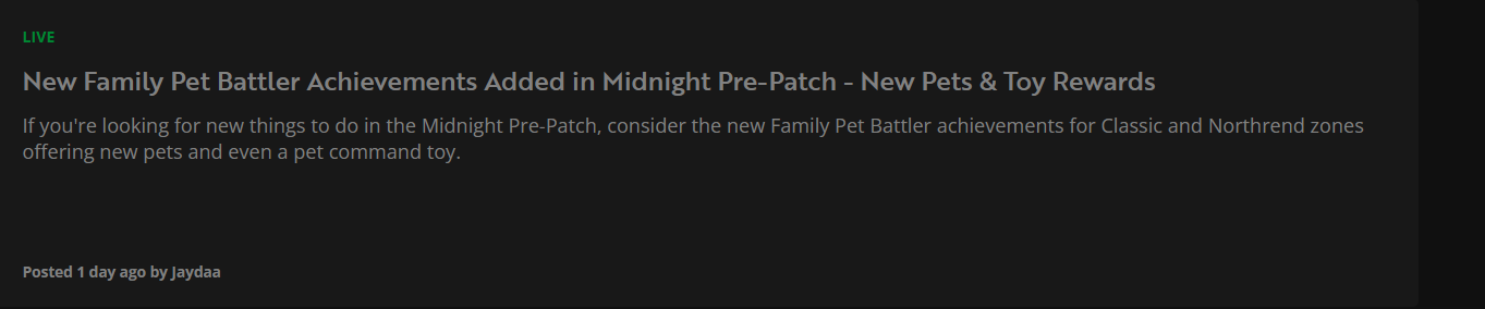 >>732204518New pets don't battle, they're collectable only. The new achievements are for old zones because new zones won't have pet battles/trainers. You also now instantly collect pets, instead of battling them. Unless they already changed their minds on this?