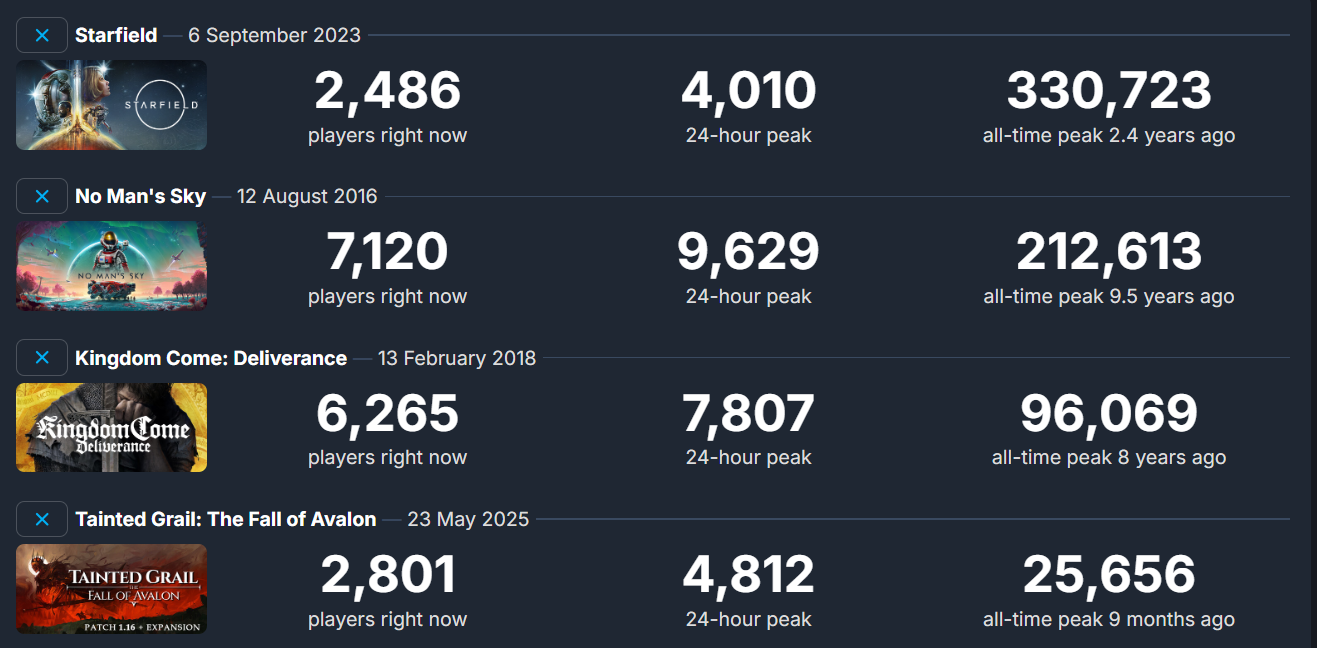 >>732197538Was Starfield really a flop though?>85 (9) Metacritic rating on PC>300K+ peak concurent players on Steam>Top 11/11 games in terms of mod/download count on Nexus>Has/had a /vg/ thread and seems like it has a big presence on YouTube/Reddit and /v/I feel like despite people shitting on it online, it's still played by a lot of people and especially enjoyed by it's target audience of retired US marines who wear baseball caps, have a moustache, sunglasses, and love BBQ, the missus and the two kids.
