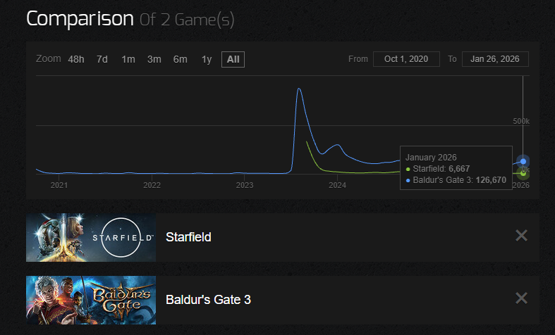 Bethesda died in the minds of the consumers when the turd Fallout 4 was released. Even the last holdouts abandoned Bethesda after the mess that is Fallout 76. Starfield just served to confirm what everyone already knows about Bethesda, and that is that they don't know how to make a good game. They only know one formula -- The appeal to the lowest skilled and lowest IQ ultra-casual player.