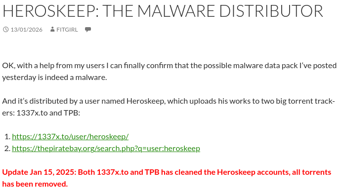 >>732200841>minersFitgirl literally called out Heroskeep for malware last month (and that wasn't the first time she called out malware in the piracy community), and hasn't used miners (on a page transparently and openly dedicated to them) for nearly a decade.