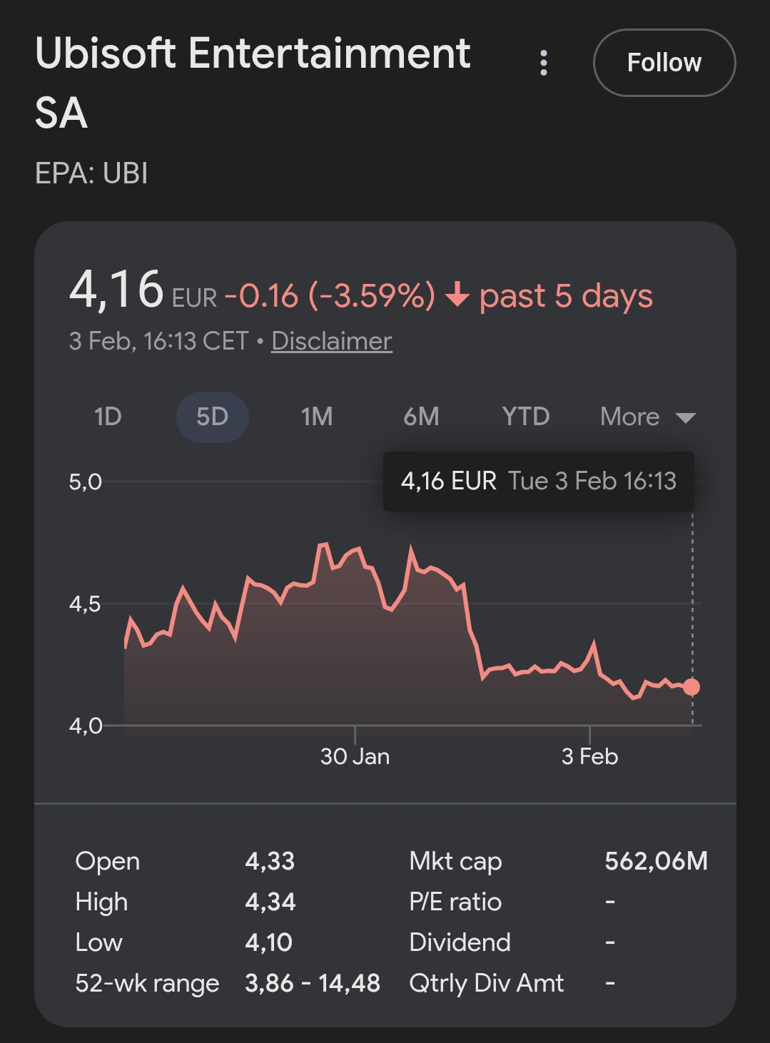 >dropped another 3%Did they just give up, are we actually going to see sub 4 euros this week