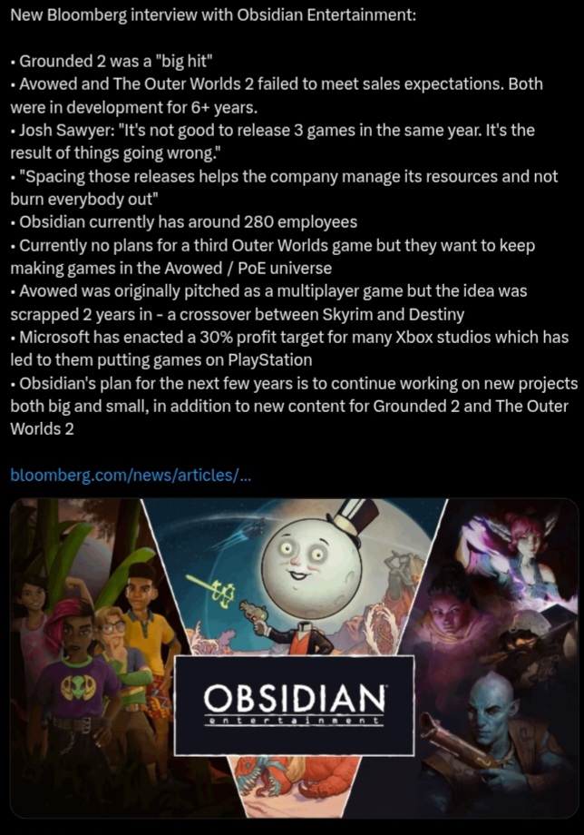 >>732206907>Since it was acquired in 2018, Obsidian has been prolific, releasing a half-dozen titles, including last year’s trio: the trippy fantasy role-playing game Avowed, the survival game Grounded 2 and the dystopian sci-fi RPG The Outer Worlds 2. (Some other studios within Microsoft haven’t released a single game in that period.) While Grounded 2 was a big hit, the disappointing results from the other two have led Obsidian to “think a lot about how much we put into the games, how much we spend on them, how long they take,” Urquhart says. Both Avowed and The Outer Worlds 2 were in development for more than six years, inflating their production costs and the company’s financial expectations. One of Urquhart’s missions is to cut down development timelines to three or four years per title.https://archive.is/UTLt9