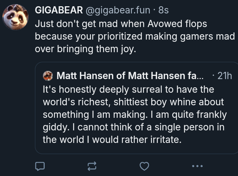 >>732207109Avowed literally nailed the hardest part of the game and somehow fucked up the easiest shit. If Avowed 2 has better writing, companion, some romance, and they make the individual explorable areas larger, it will be a great game.Avowed was ALMOST great. Combat and exploration are fun but the writing is so bad and bland and it feels like there is 0 world interactivity. They can keep the combat/exploration and just actually get some good writers on staff and it can be a really good series.