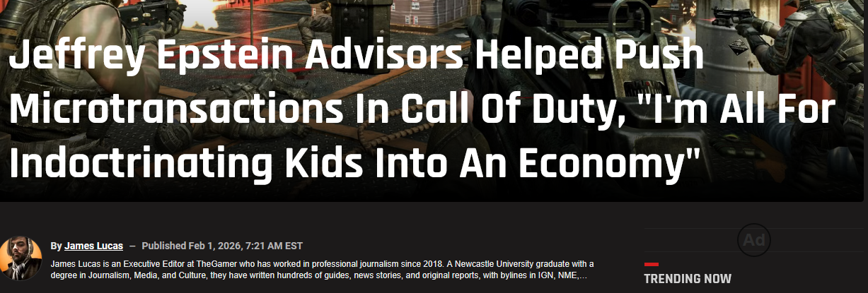 > In newly uncovered correspondence between Epstein, futurist Pablos Holman, and former Activision CEO Bobby Kotick, taken from the over three million Epstein Files that were released on Friday, conversations were had about "indoctrinating kids into an economy" through in-game cosmetics.> Call of Duty: Ghosts, which launched later that year, went even further, with paid "special characters", voice over packs, skins, camos, and even weapons; it's not hard to draw a line between these conversations with Epstein and Kotick and the sudden boom in microtransactions, but what's unnerving is the intent behind them to prey on children.> This isn't the only appearance of Kotick in the files either. If you search for his surname on the DOJ website, there are over 300 results, and he appeared to be close enough to Epstein that he was even invited to his island in 2012.