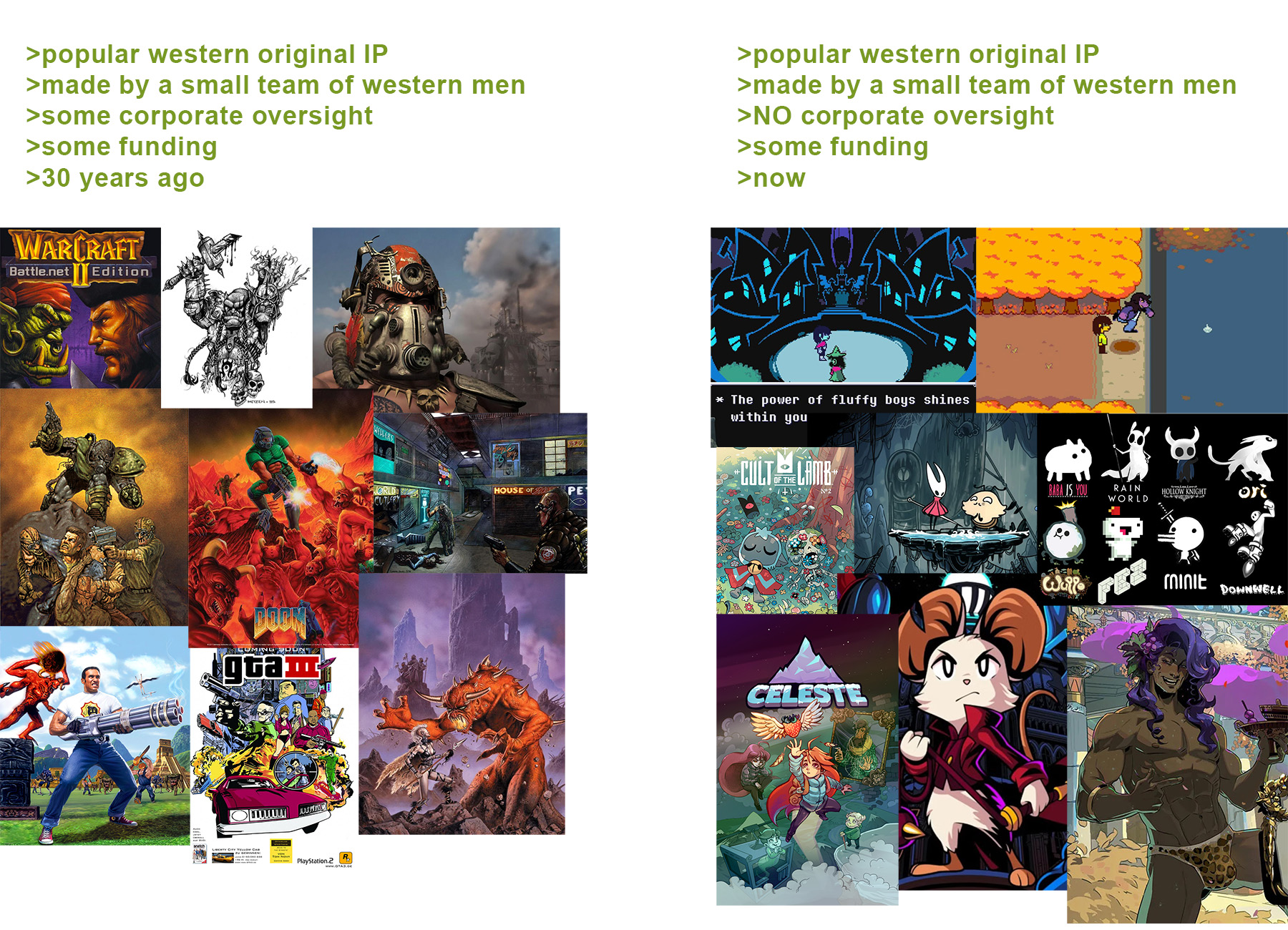>>732215338>left is samey grimdark slop>right is samey furryslopAll this proves is that westerners have always been devoid of creativity when it comes to video games