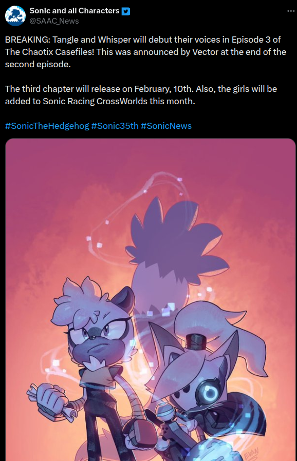 >>732234170>They're detectives but does Sonic NEED a detective group? Not really.I think it's necessary because Sonic might discover stuff incidentally while destroying things he dislikes, but he probably isn't going to follow clues or put things on a cork board. You could argue Tails would do that I guess, but Chaotix exists so Sonic team can write Lupin sometimes.