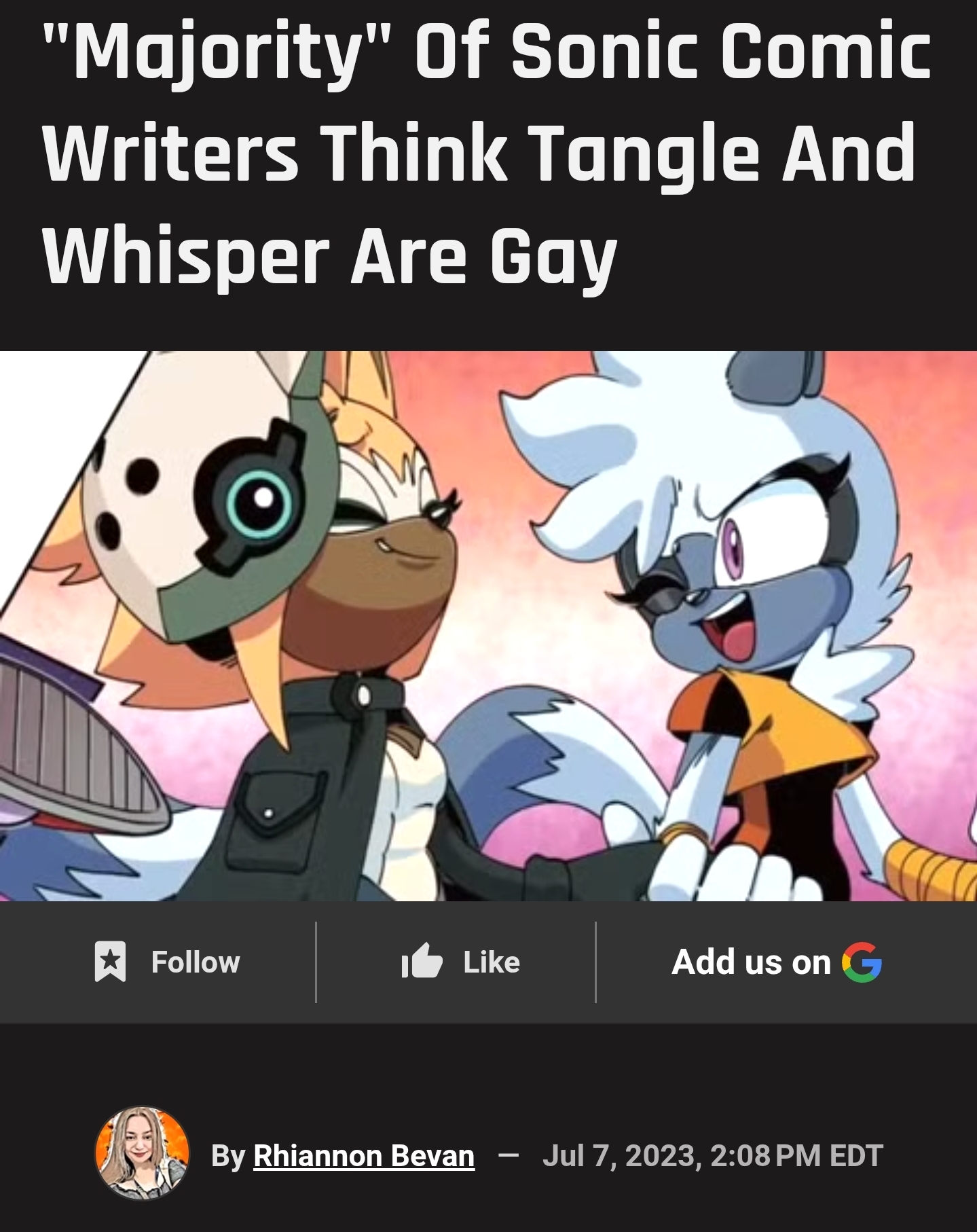 >>732223842Honestly the only reason I would want them to show up in canon. The amount of seethe from the terminally online Sonicfags and the fags that only listen to comic summaries would be so delicious.