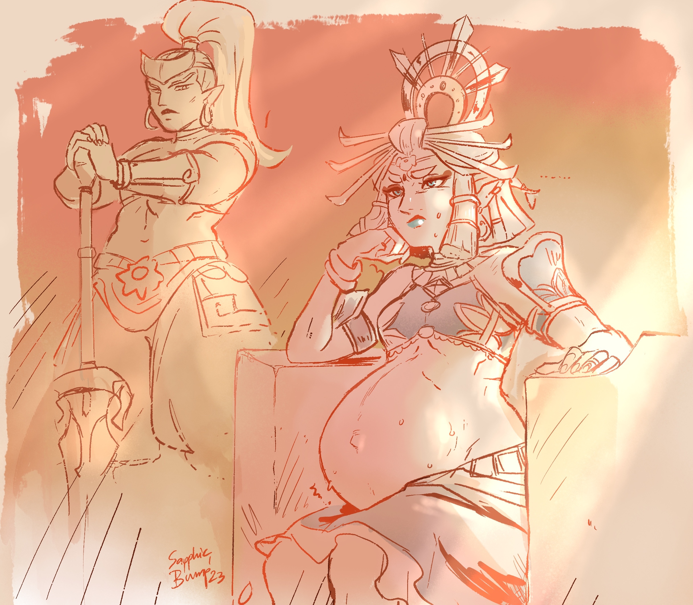 >>732296157Gerudo Town is a cauldron of feminine yearning, I think half the town would shamelessly stare at her belly while the other half would ambush her just so they could fawn over her.