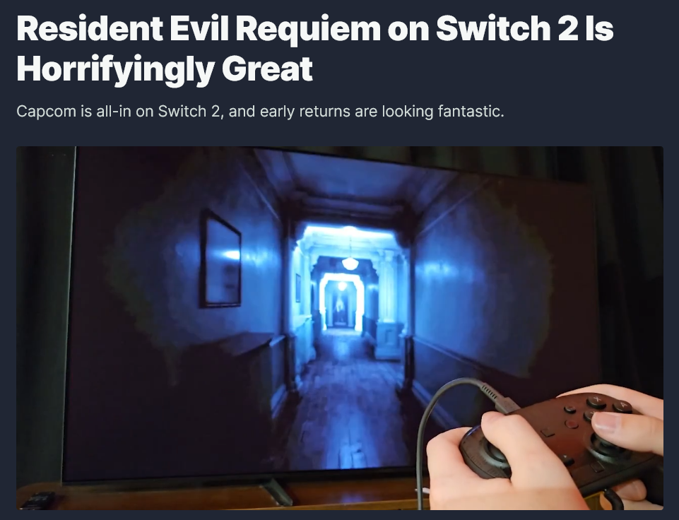 Developers are starting to learn how to use the Switch 2 hardware and DLSS to get the most out of ithttps://www.ign.com/articles/resident-evil-requiem-on-switch-2-is-horrifyingly-greathttps://www.gamereactor.eu/resident-evil-requiem-preview-capcoms-horror-titan-looks-promising-on-switch-2-1669083/