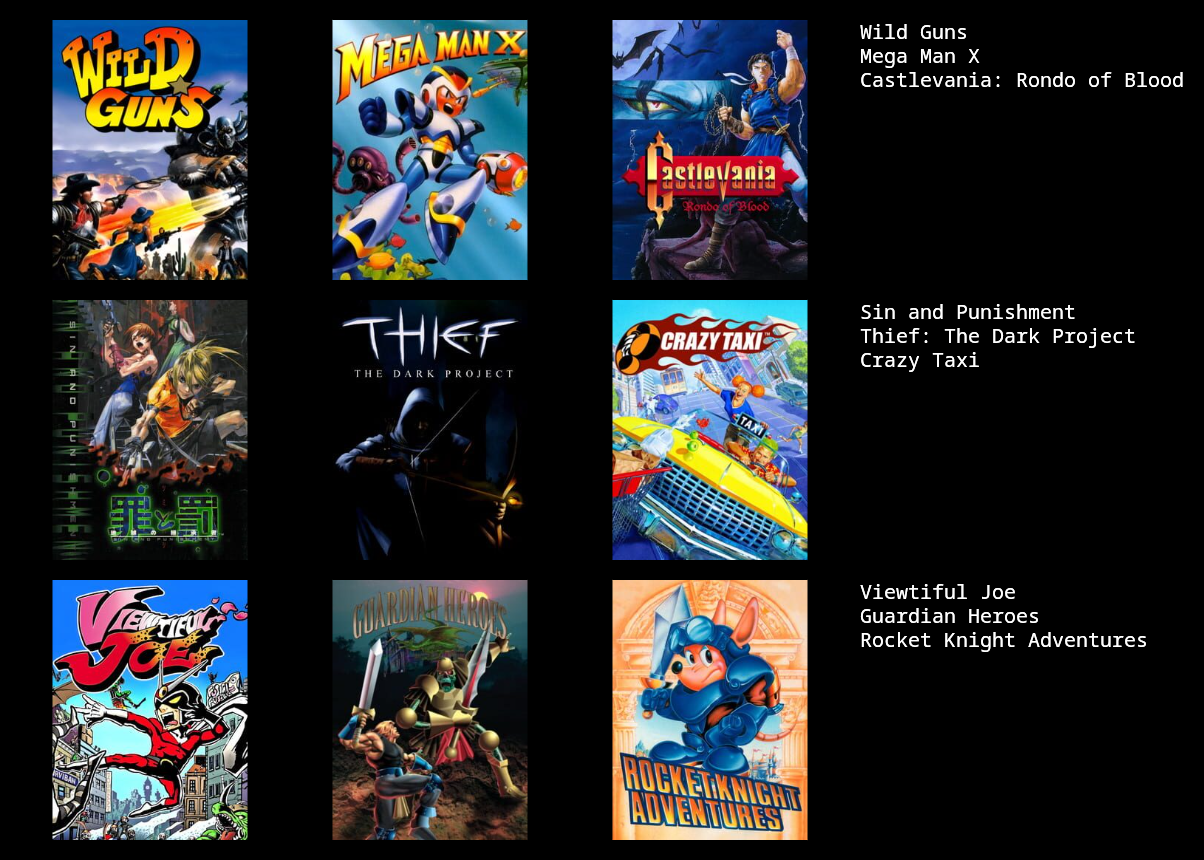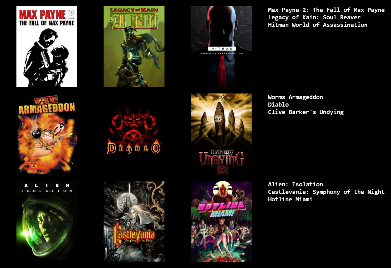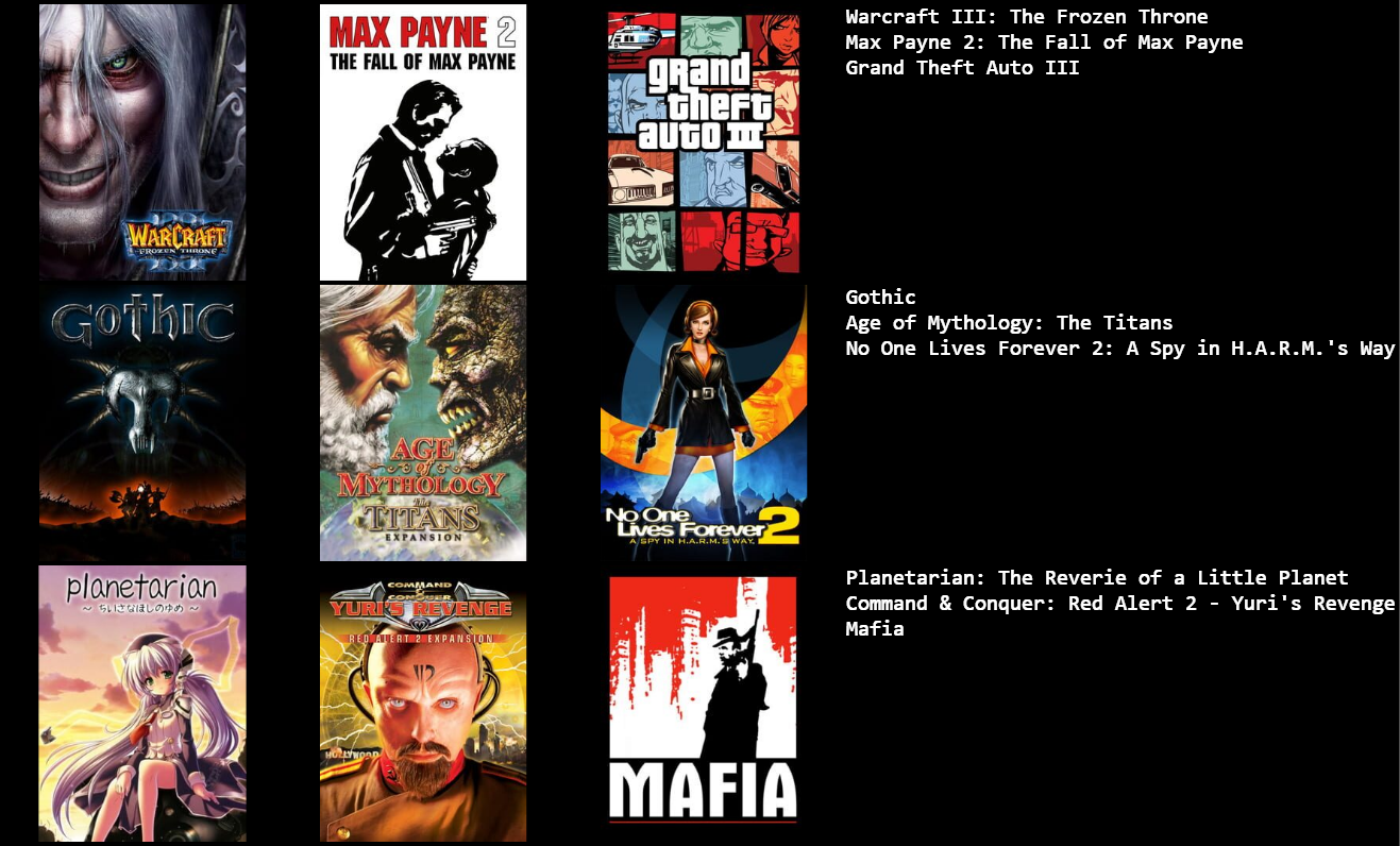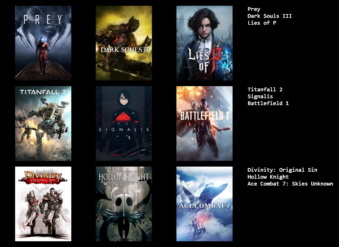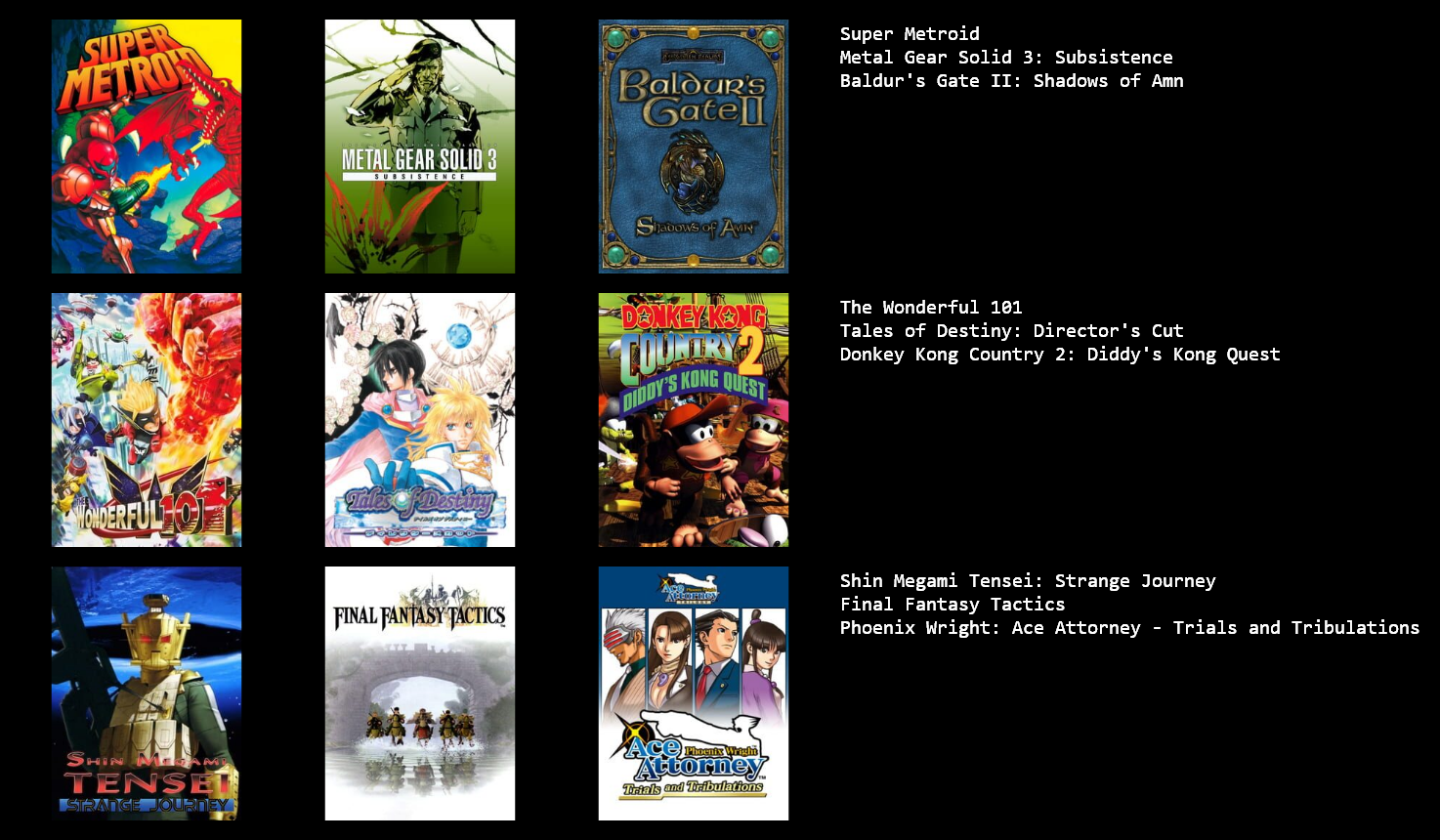 >7322270021/2 Hades / FFX. I did finish out FFX and I didn't outright hate it but I wasn't very fond of it in the end.>7322276511/4 Crazy Taxi / MMX VJ GH. I probably would have liked Rondo if I had played it when it was new. I wonder how I'd take to Sin and Punishment, given how usually I dislike most of Treasure's games.>7322283121/1 Xeen. It's interesting to see the M&M games beyond Heroes get mentioned a bit more frequently. I liked 3, 4, and 5, then bounced off of 6 immediately and never touched the series after that.>7322338840/2 / Dig Dug and Moon Patrol. Good to see arcade love but I just never cared for either of them, and played both recently too.>7322353840/2 KH DC. I don't know why but I didn't care about playing Dragon's Crown after ten minutes. But you have some gall calling anyone a normienigger and having anything KH related in your list.>7322355692/2 SM FFT.>7322365290/0 Just use single quotes. Sucks, but that's how it has to be done now.>732236591Yeah, make a 3X3 instead. The point is to cut deep. Cut the FMV games like 428 and 13 Sentinels, the bullshit like Minecraft and Terraria, and the handheld games, and go from there.>7322368851/2 FE / KH. I'm playing Engage now and I like it enough, but, man, some of the character design and balancing and writing is really not good.>7322377051/2 ME / H2. I usually dislike most all FPS, but I liked Mirror's Edge.>732237747Dude I'd put Metal Slugs 1, 2, X, and even 3 over Dig Dug, Moon Patrol, and Kid Chameleon at least. I struggle with placing old favorites myself but I always ask myself if I still really would want to be playing these games right now. Nostalgia says yes, but, be true.