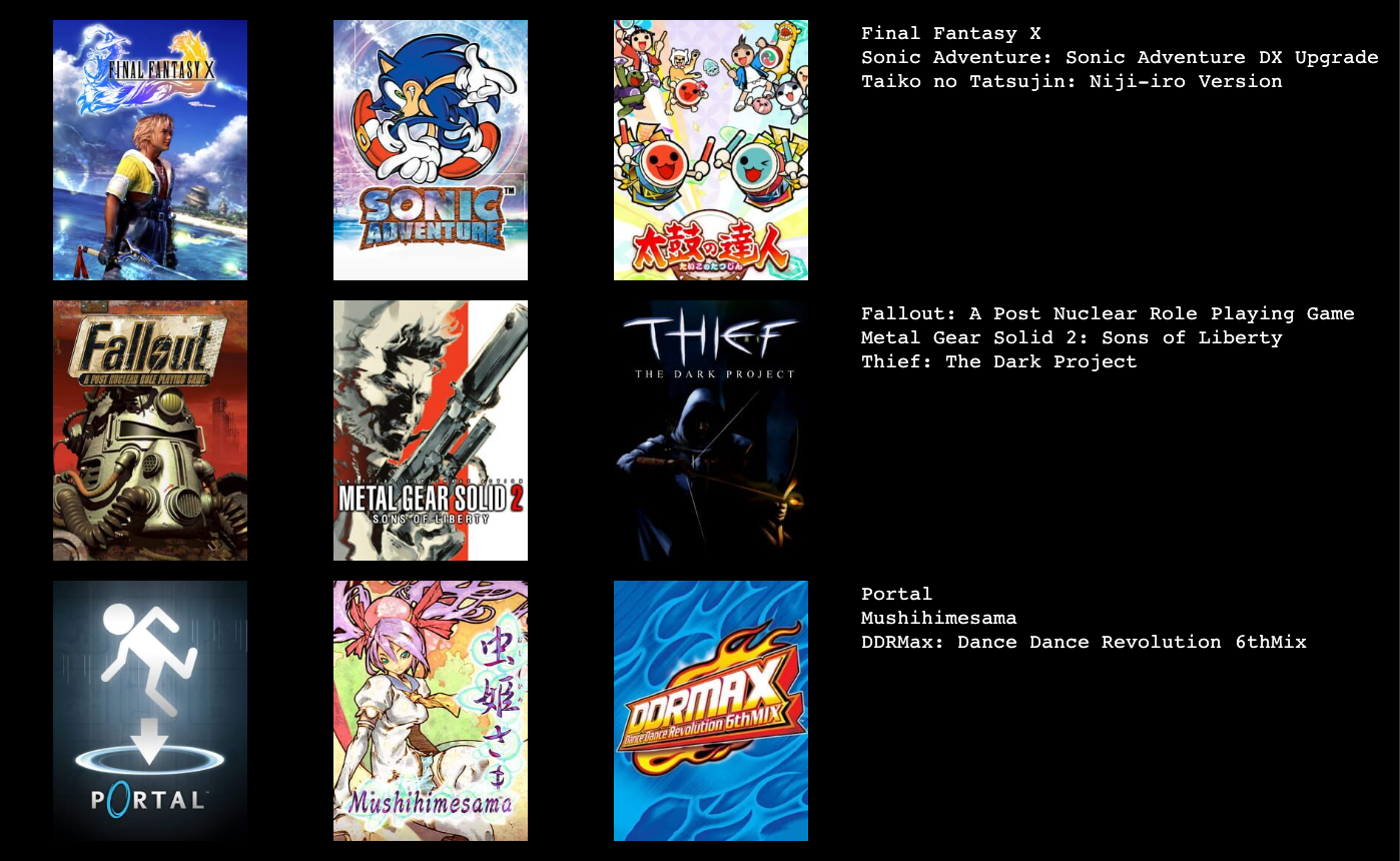 >7322270021/2 Hades / FFX. I did finish out FFX and I didn't outright hate it but I wasn't very fond of it in the end.>7322276511/4 Crazy Taxi / MMX VJ GH. I probably would have liked Rondo if I had played it when it was new. I wonder how I'd take to Sin and Punishment, given how usually I dislike most of Treasure's games.>7322283121/1 Xeen. It's interesting to see the M&M games beyond Heroes get mentioned a bit more frequently. I liked 3, 4, and 5, then bounced off of 6 immediately and never touched the series after that.>7322338840/2 / Dig Dug and Moon Patrol. Good to see arcade love but I just never cared for either of them, and played both recently too.>7322353840/2 KH DC. I don't know why but I didn't care about playing Dragon's Crown after ten minutes. But you have some gall calling anyone a normienigger and having anything KH related in your list.>7322355692/2 SM FFT.>7322365290/0 Just use single quotes. Sucks, but that's how it has to be done now.>732236591Yeah, make a 3X3 instead. The point is to cut deep. Cut the FMV games like 428 and 13 Sentinels, the bullshit like Minecraft and Terraria, and the handheld games, and go from there.>7322368851/2 FE / KH. I'm playing Engage now and I like it enough, but, man, some of the character design and balancing and writing is really not good.>7322377051/2 ME / H2. I usually dislike most all FPS, but I liked Mirror's Edge.>732237747Dude I'd put Metal Slugs 1, 2, X, and even 3 over Dig Dug, Moon Patrol, and Kid Chameleon at least. I struggle with placing old favorites myself but I always ask myself if I still really would want to be playing these games right now. Nostalgia says yes, but, be true.