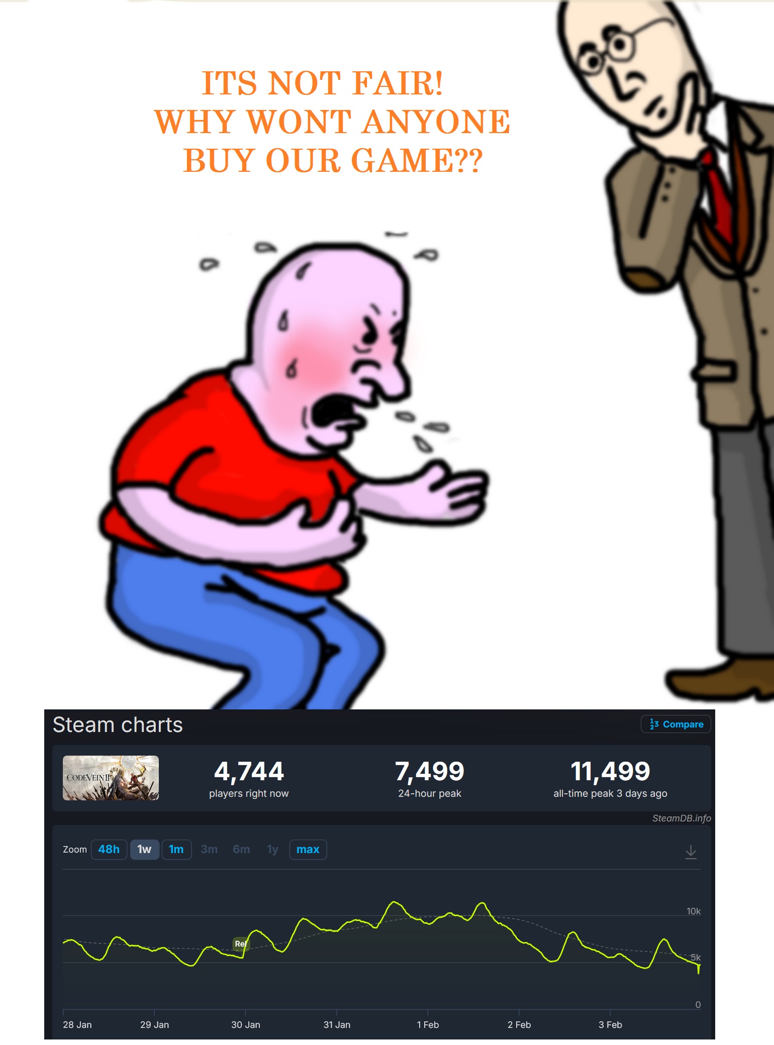 >>732227386And the game is flopping because of it.11,499 top players. A whopping 22,396 less players then the first.Good riddance.