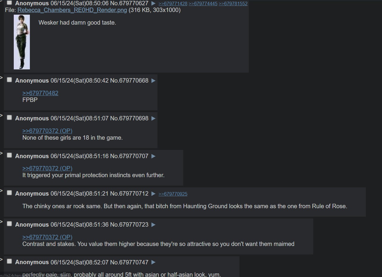 >>732227965She doesn't make my dick twitch like Jill does, but I think she's a more likeable character (not so much in Revelations 2).