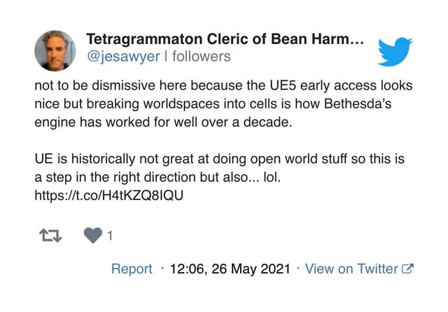 Speaking as someone who's both done a good bit of modding in Creation Kit, and developed for Unreal, he's probably right. UE5 is really the first engine that Bethesda could have ever swapped to, and even then, there's not a lot of gain for the colossal pain it would cost in time, effort, and money.You were not going to get the results of large highly manipulable, dynamic, and persistent world out of Unreal 3 or 4 (or lmao Unity). You maybe could have licensed another studio's in-house nightmare, but at that point, you may as well have just stuck to the one you were developing yourself.The best thing UE5 really brings to the table, is World Partition, but that was BASED ON THE CREATION ENGINE- going so far as to lifting terms directly from the Creation Engine when it was first revealed. You could argue it's easier to train people on UE5 than Creation (not true, given the number of mods still coming out for Skyrim), but obviously there's a shortage of well-trained UE5 developers- given how many unoptimized games use the platform. Oh, and Lumen is a piece of shit.