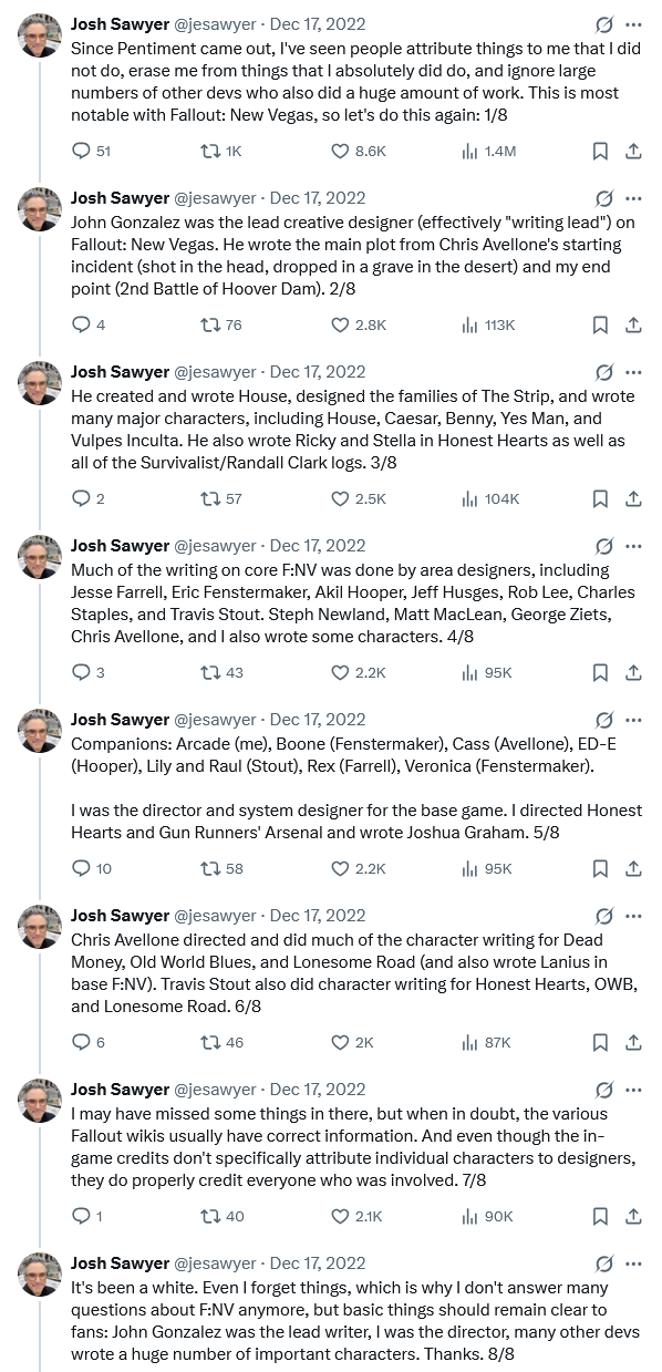 >>732299783>why chris?Because he's the best thing that happened to Obsidian, and the company crumbled the second he left. He had been there from the get go as well, and seemed to understand was development on the Gamebryo entailed.>most of the stuff he worked for was super bland or pretentious like ulysses, which is unironically his self insert OC lolIt is unironically not lol. Him being the only non-hostile NPC in the expansion makes people for some reason believe he's the mouthpiece for the developer, when for example nobody says that for Elijah even when both were written by Avellone and Ulysses intendedly comes across like a coping loser that uses you as a figurehead to blame all his past failings on.>John Gonzalez was the man that wrote the whole new vegas plot + dlcsIn what universe? Avellone was the one organizing Van Buren PnP sessions with the devs back when that game was in development, creating the basic mythos that evolved into NV. He wrote the basic factions and plot, characters like Cass or Lanius and was the lead director on the DLCs (with the one he had the least to do with, Honest Hearts, being the weakest one, and even then him saving some of Graham's dialogue which was gonna be cut not intentionally but due to other developers' incompetence).Gonzalez was a very good writer as well, creating Randall, writing House, co-writing Caesar with Sawyer, and his contribution should be praised as such. New Vegas would be a lesser game without his input. But to imply he was "the man that wrote the whole new vegas plot + dlcs" is just wrong.