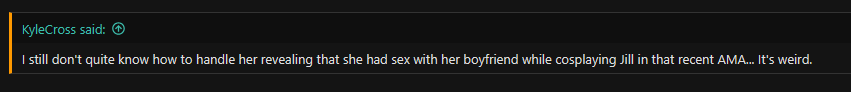 >>732249182She claims her boyfriend had her dress up as Jill to fuck. She also apparently attends orgies at festivals.