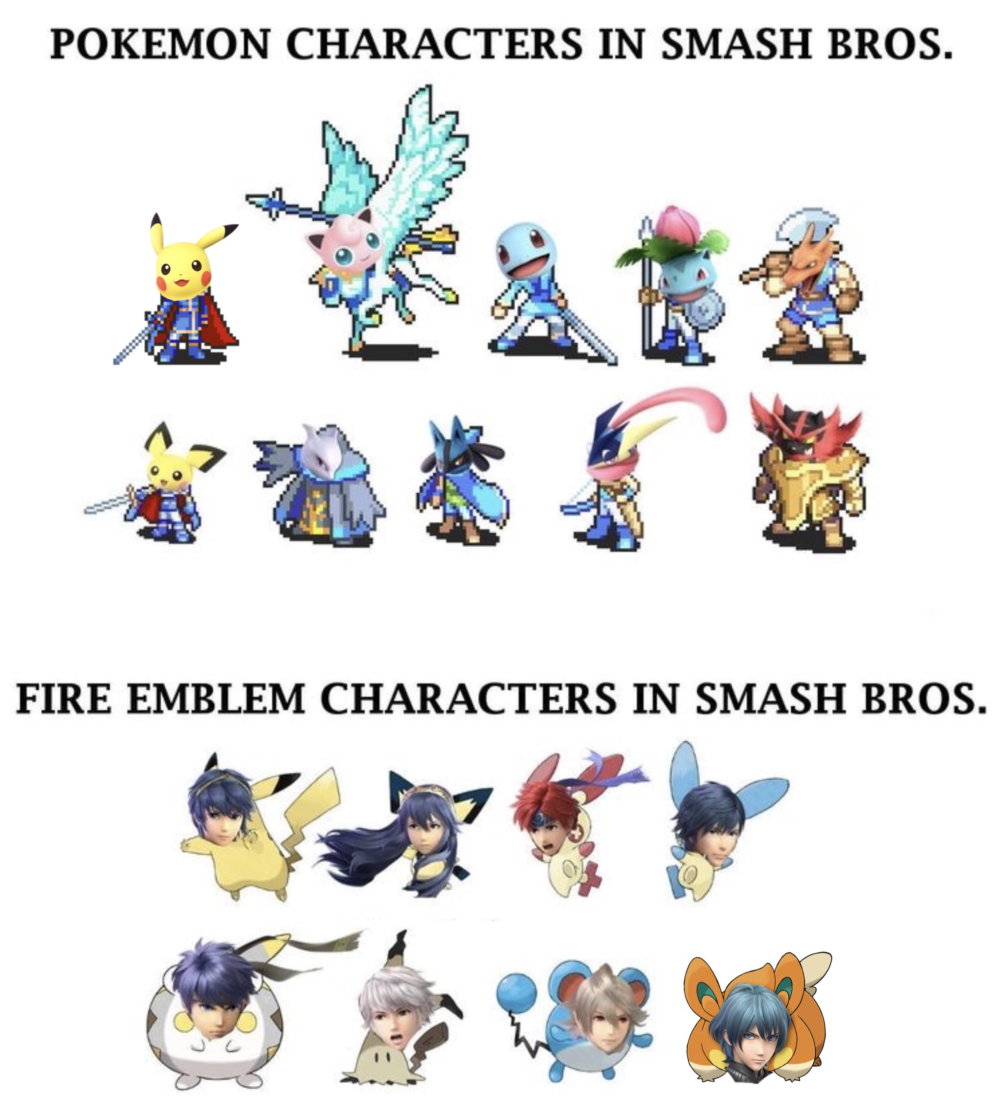 >>732276492>How the fuck are Byleth, Robin, Corrin just another Marth?Nope, the joke is that they’re all anime humans wielding some kind of sword. Corrin despite being a “Dragon” still needed a sword.>>732284058Pokémon are have different kinds of elemental types while Fire Emblem protagonists are mostly humans who mostly wield swords because swords are the default heroic weapon.