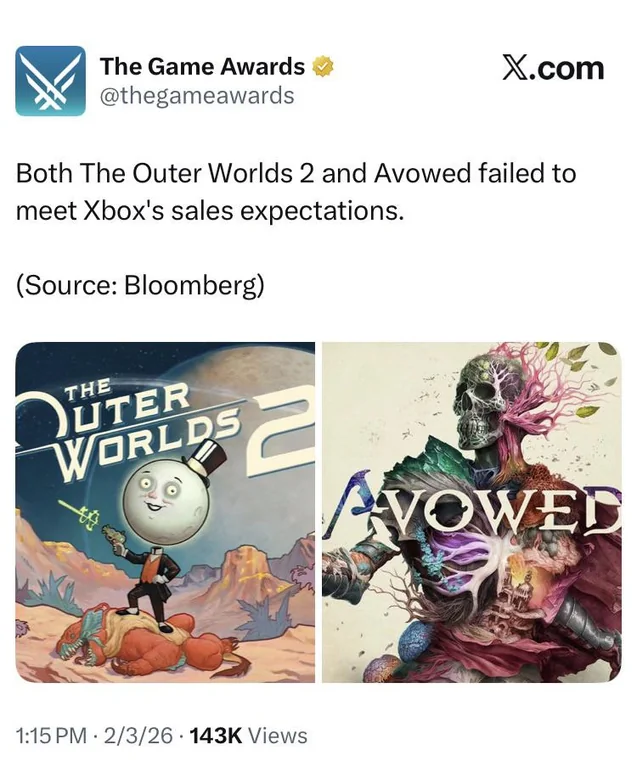 >Obsidians The Outer Worlds series second game failed to meet sales expectations and has since then according to insiders last week, will not be getting a third installment. A recent official announcement by Microsoft has since then confirmed the series is officially cancelled.>Avowed, from the same studio, has also been put under the microscope after also failing to meet expectations and now new rumors within the industry and from sources on the inside are speculating it too will be canned leaving the studios future up in the air.Wait -- But I thought these games were selling well. /v/ told me they were doing well. And people kept saying >go woke go br-ACK... Implying the games were doing well.What happened?