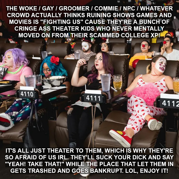 >>732268302>Noooo just let me fuck over what you want and voted for bro! Nah. I'll say it again, who the fuck do you people think you are? Why do you guys believe it's your god-given right to fuck over and interfere with shit, even when you lost, just because you deem it heckin mean/bad and don't like it? I swear Leftism is just peak narcissism. Everything you fuckers do is justified as far as you all are concerned, because you're just le good human beings with "empathy"(you guys really have loved that word the past year).