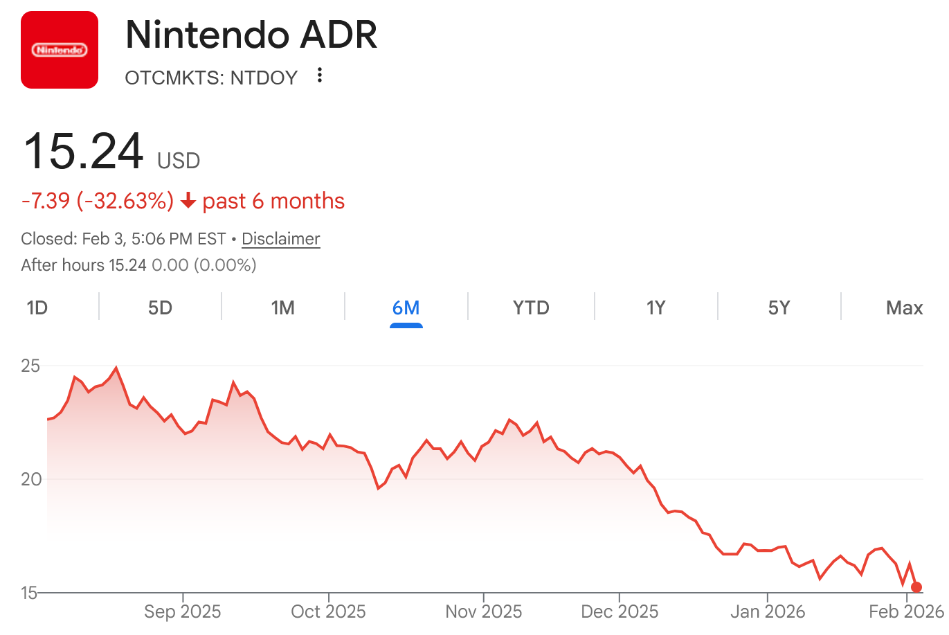 >>732251581Nvidia is up .2% over 6 months, Nintendo is down 33%Lol