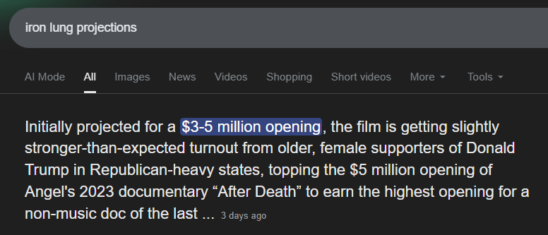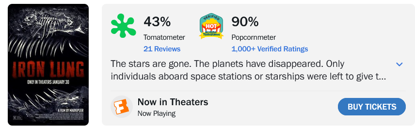 >>732298262The funny thing too is that Iron Lung was originally only slotted for around 1000 theaters in the US and now it has a full wide release of over 3000 theaters. I saw it in a small college town in Texas that usually only has mainstream movies in it.