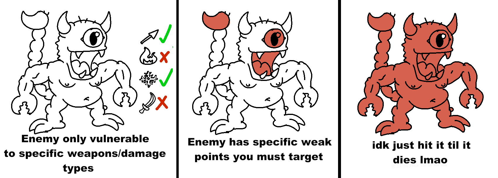 Left when it makes sense. Like a werewolf being immune to normal weapons and weak to silver. Middle is good too when it makes sense. A zombie should die instantly when it's head is destroyed, but not if its being animated by magic.. Right is for zoomed.