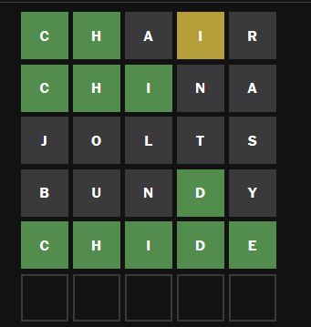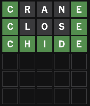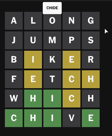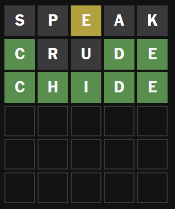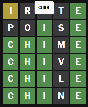 I really wanted to try "chode" just to see if it's valid.>>732260661Hard mode is badly designed because you're forced to tiptoe around all the words with 1-letter variants, and if you accidentally hit one then there's no strategy that can save you.>>732262764>not moving the C with only two guesses leftsee >>732262770