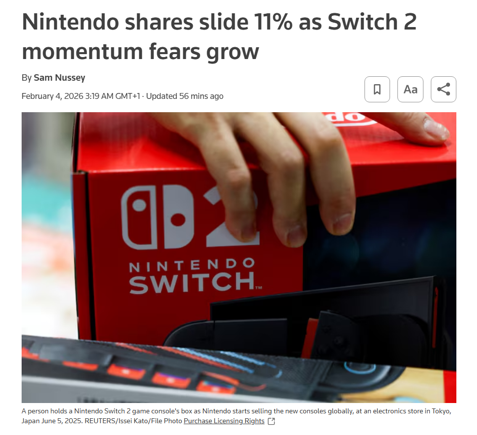 Nintendo stock is now down 40% in 6 months. Switch 2 isn't doing so well. Sales figures are thought to be tampered with.