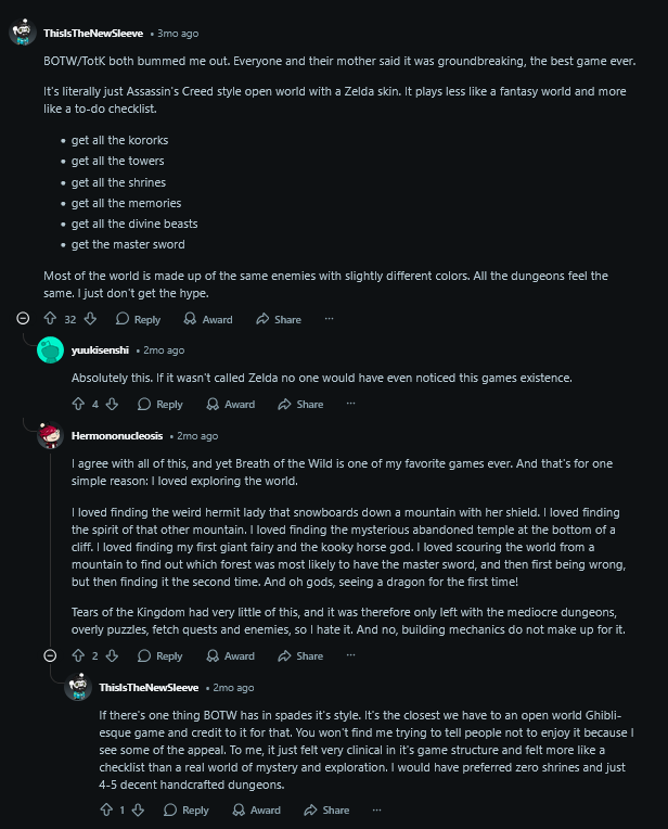>>732270930I'm replaying it and while fusing weapons is great, making vehicles is just not my cup of tea. It's impressive both tech-wise and design-wise, but it affects the atmosphere and pace of the game too much. Like I do appreciate how each one of the parts behave in such a detailed way that you can invent all sorts of applications for it, but seeing OP's pic, for example, that picture doesn't make me want to produce a truck.I wish the Zelda team dared to go a bit less clean with their game design. Totk and BotW are like swiss watches in which everything has a specific purpose and the mechanics all relate to each other in a closed circle. And that's great, but if because of this, they can't have all that many monsters, or the dungeons can't be all that complex, and the story can't have a rythm, then something valuable was lost in the way.