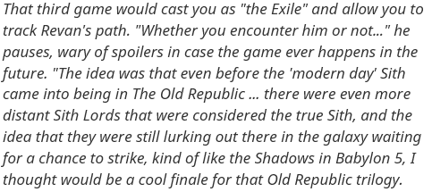 >>732331523I really like the theory that the 3 sith lords in K2 represent each prestige class:- Sion is Sith Marauder, and his dialogue is all about rage and fury- Nihilus is Sith Lord and he's all about force hunger- Kreia is Sith Assassin and she's all about trickstery, subterfuge and manipulationWith this in mind Kreia's dialogue sounds rational on the surface but always has a hidden manipulative layer, and the peak of DS option would be for PC to sound and act in a similar subtle way. Instead all we get is Sion's rage.