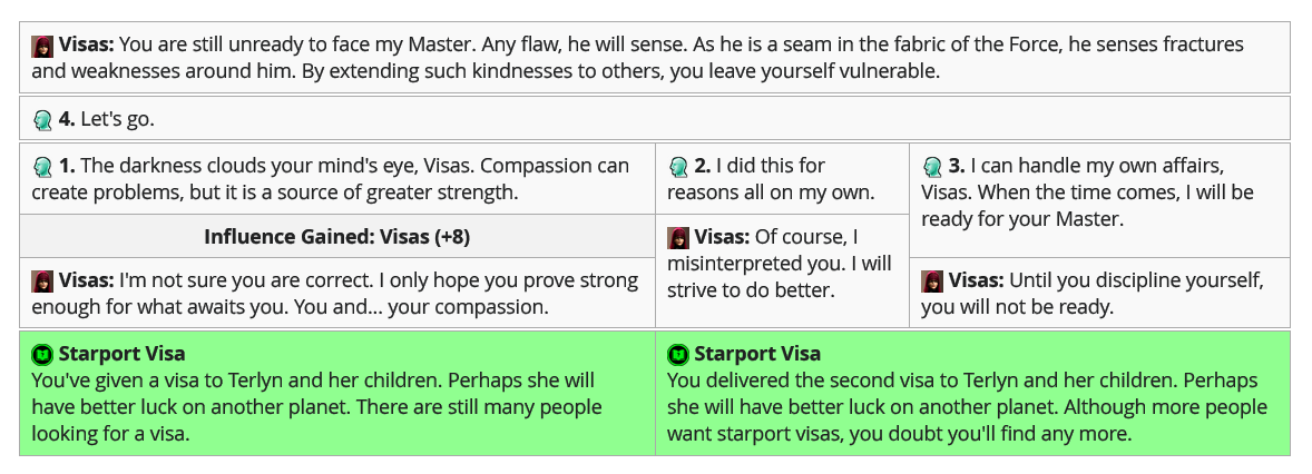 >>732273457Visas still disapproves if you and her are both lightside and you tell her to watch her aim in the cantina fight.