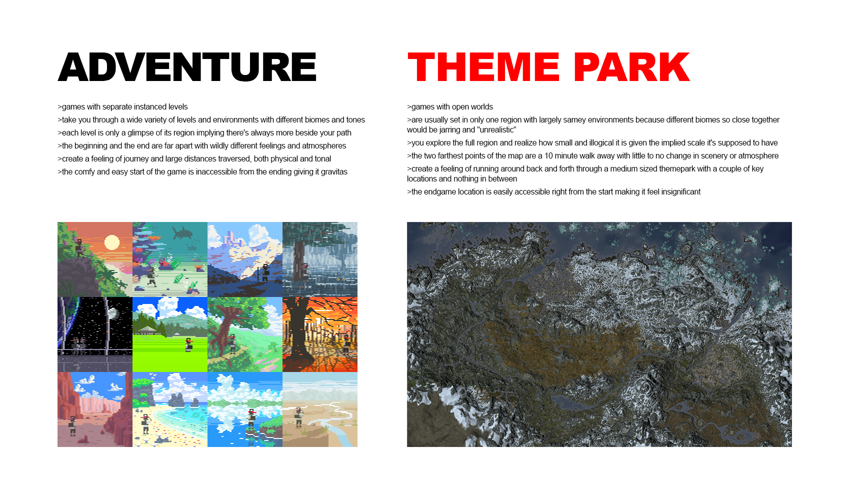 >>732297298You have this in reverse. Theme park refers to instancing where you travel to X location to engage in a heavily scripted on rails activity. Making the open world aspect superfluous window dressing that may as well not even exist because all you do is fast travel anyways, or if its not available inevitably gets patched or modded in to appease preddit QoL fags. Personally I want a new game that's like daggerfall all in on procgen so I can just larp as a humble goblin slayer doing radiant quests to kill them for procgen loot all day chasing god rolls. Fuck your chosen one save the world storylines.
