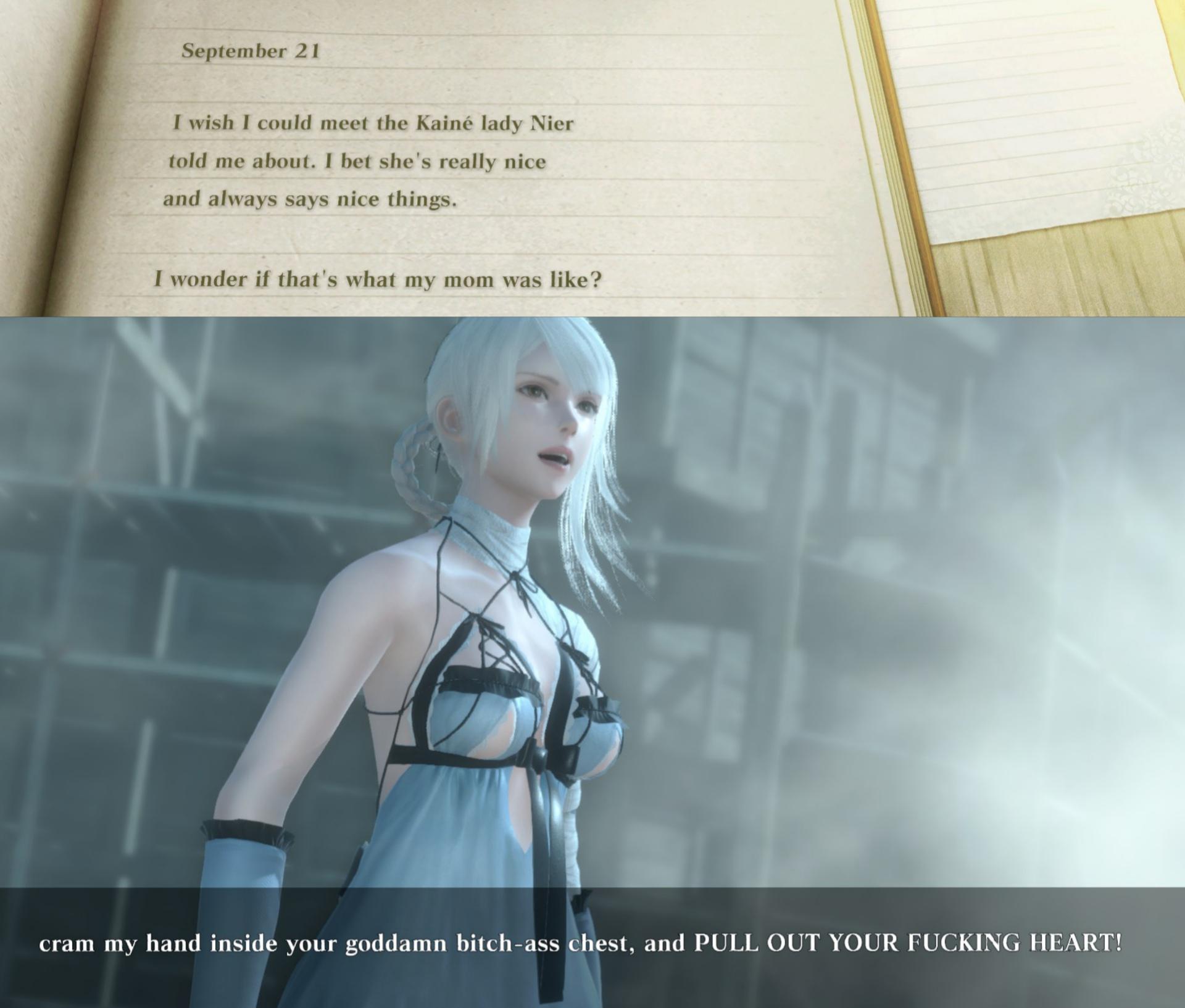 >>732280930Did (You) even play the game? Kaine falls deeply in love with Nier after the timeskip and cannot express her feelings due to her own self-loathing and Tyrant partly possessing her body. It was even explored in the "The Narrow Gate" novella. Nier falls in love with Kaine in both Ending C (the one where he kisses her and loses it after her death) and D (the one where he sacrifices himself for her)