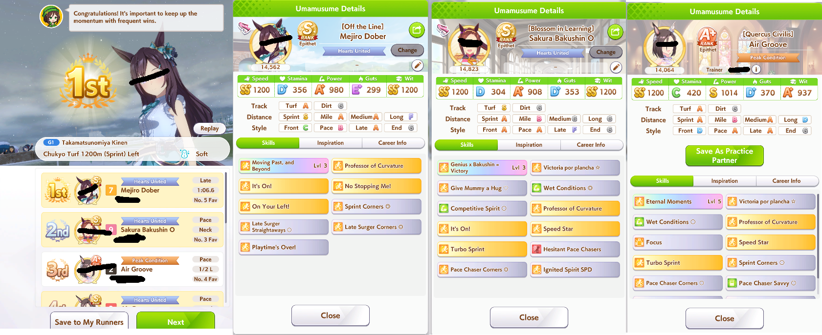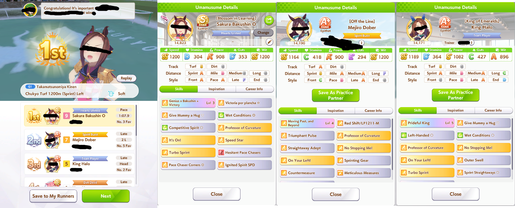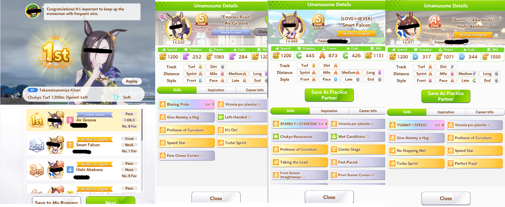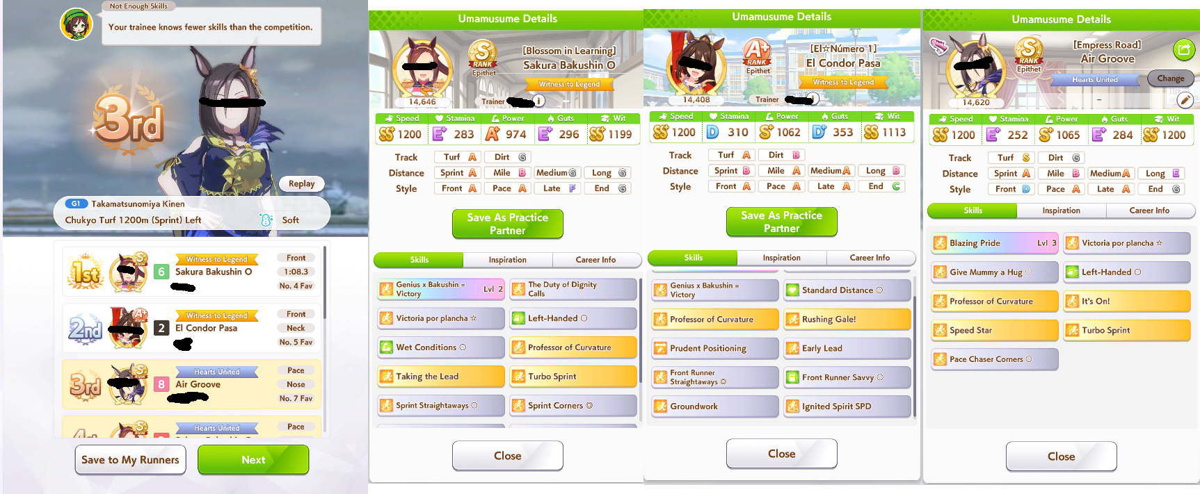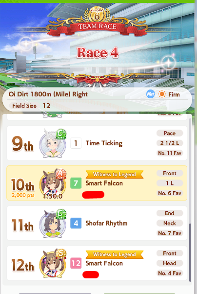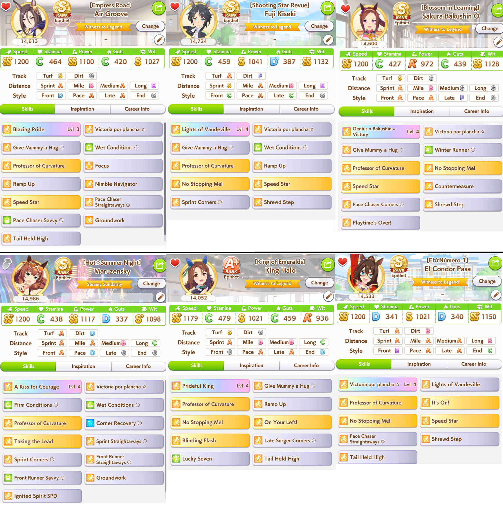 The top row is my current leaders that seem to win most often, but it's all over the place.Halo gets some wins now and then, Maru too, but I don't think enough to replace any of 3 pacersI've been working on El, but she's underperformed so far. I have one with S as well and better skills but lower power and neither have shown potential so I'm not sure it's worth the squeeze of grinding out or if I should just move on to dirts
