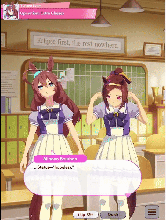 >>732295315It's monster rancher except you race cute horse girls instead of battling each other. PvE is easy enough but PvP requires engaging in stupidly deep mechanics to properly express the racing strats you want your trainee to have. Music is great, toasters can run it and you get different careers with their own stories and challenges with each girl that are further supplemented by newer assets that keep each one relevant in each others stories and events. One thing you need to be very aware of is that due to steep learning curve that the threads here will always be full of gaslighting because gameplay discussion is usually between the sweats that want to be best. Also, be sure to use your 3 star unit selector ticket on Tokai Teio.