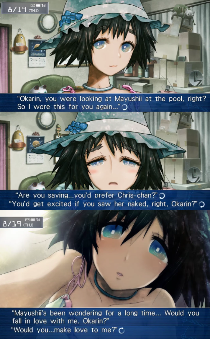 >>732298281if we include sg0, either anime or vn, mayuri's friends p much ask her about this early on. they have the same idea as you and assume something more going on. im the "possibility"-fag tho so im not sure if im the right fit to reply to your greentext, but ill say, she responded to them in a way that indicated she doesnt "really" think about it, and so im not sure if that attraction is quite realized or ever has been; only at least potentiated. by "really" here, we can also put it in perspective with other scenes like fubuki gifting okabe lingerie for mayuri at the christmas party and he's embarassed & rejects the offer... sure they can think about sex & etc but it seems steered away. sure, okabe in this timeline is a kurisutinafag... but he's embarassed on the outside in a way not disimilar to mayuri in the other scene. to ascertain mayuri's mental states here involves a choice as to whether it is like okabe's (embarassment; steering away not because it's true but because it's unknown, kurisu (emotional hard spot) exists, and/or japanese cuck social norms) or something else with exclusion of other ideas (it's true, she likes him romantically, no cuck jp norms, etc). but my read is that i dont think the fucking characters know what they feel themselves to be frank. hence potential-fag. and she says okabe has someone else and is saddened BECAUSE of mayuri -- perhaps that drives her reaction? perhaps in the anime when she says she loves him more than kurisu it's out of that pain, rather than saying anything clearly romantic. perhaps the uncertainty fits the theme of the show.love in general is clear. it just *seems* more sisterly to me given facts of what occured in the "important" timelines. but the fact that there is uncertainty & time-travel ideas about facts/events themselves and their relation to how characters act is part of my motivation in potential-fagging for anything romantic, but it's just not the clear path of least resistence in my conception
