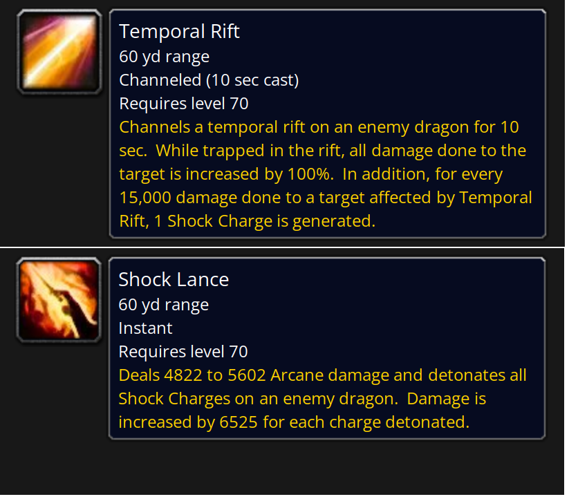 >>732292154>you read what the ability does, retardon Temporal Rift where does it say "channel this until you get ONE HUNDRED stack because that is the maximum"?on Shock Lance where does it say "do not use this until you have ONE HUNDRED stacks from the temporal rift">it shows on the fucking boss's unit framefirst of all, why is it hidden to the tiny little debuff bar of the boss unit frame where I have to hover over it with my mouse to see anything?second, the boss unit frame shows the debuff stacks coming from all other bronze dragons too, so I have to guess which one is mineno, there should be like a bar on the middle of my screen indicating the stacks and when it is full the Shock Lance ability should light up indicating that it should be usedjust admit that blizzard made a bad design decision here