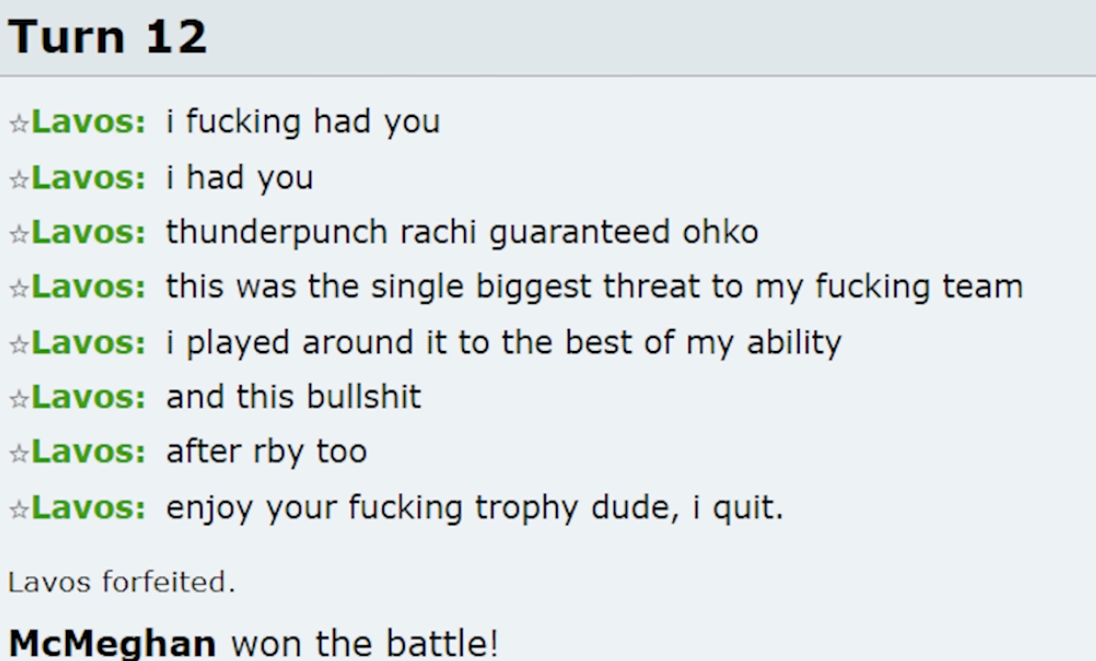 >>732290239>rages out and quits forever because he lost in the semifinals of a notoriously hard tournament>that he'd already fucking won the previous edition ofPokemon fans man, not even once
