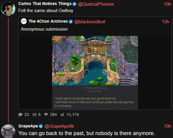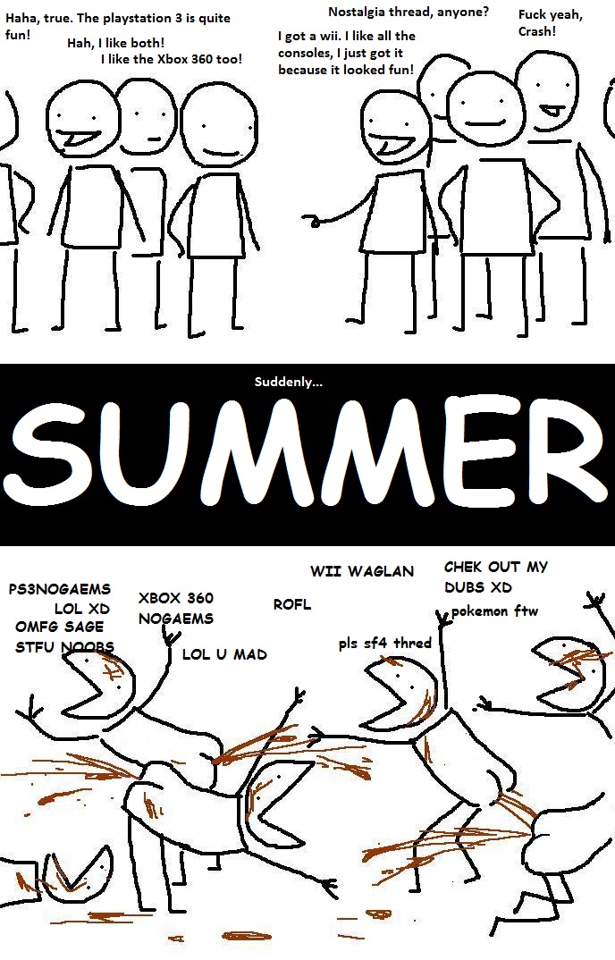 Boy I hate anons complaining about the state of the board.Don't misunderstand me, they're not worse than the posters they're complaining about, but those fellows have the excuse of being ontologically evil.Do you feel that people enjoy reading whiny posts about the good ol' days? Is your dream /v/ a grey board of undifferentiated nostalgia and malaise? Or do you somewhere realise that your posts are still below-average, and therefore making the board worse just as you complain about people doing so?It's like going to the city and spraying "I HATE GRAFFITI" in bright bold letters on a wall. If it's not intentional avant-garde art, it's the senseless ravings of a half-wit.Here's an alternate suggestion: rather than saying that you wish people would make good posts, how about you, instead, make good posts yourself? Make a thread about a game you like and have it sink to page 10 immediately? You know full well that is a deed of virtue still. If you see a thread like that, you can reply to it. And most of all, in the words of our forefathers: Hide bait threads. Ignore bait posts. Do not reply to bait posters.Or you can effortpost. /v/ has not so fallen that a /v/ingo thread would go gentle into that page ten. If you set up and host one of those, you will make /v/ a better place. You know this. Everyone knows this. You hold the power in your hand but choose to play as powerless.Because at the end of the day, you don't want to put effort into your posts. You don't want to make a post that will get ignored. You want to make a low-effort comment to get a lot of (You)s, about a topic unrelated to video games.But you're complaining about the trolls whose low-effort bait attracts (You)s and prevents vidya discussion, so that means you're the hero.