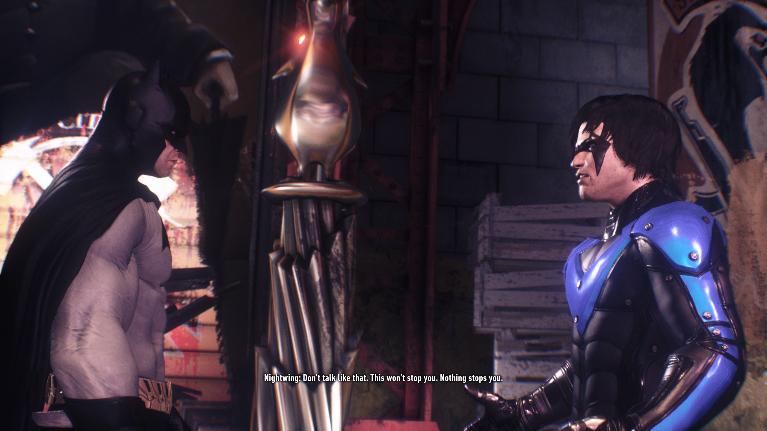 >>732308353For me the highs are>combat, predator and even traversal have been never more refined >new enemies that makes you use more of the game's mechanics >new combat and predator mechanics that spice up the gameplay even more>best adaptation of Scarecrow >Pyg's side mission and his theme as a whole https://youtu.be/dm3_BRtSQ8Q>Two-Face's monologue in his side mission and him recalling The Long Halloween events>Mr Freeze's and Mad Hatter's side missions>That entire scene of Batman and Catwoman after beating Riddler>the Knightfall Protocol after 100%ing the gameArkham Knight is such an amazing game and does so many things right, yet everyone is so focused on the batmobile