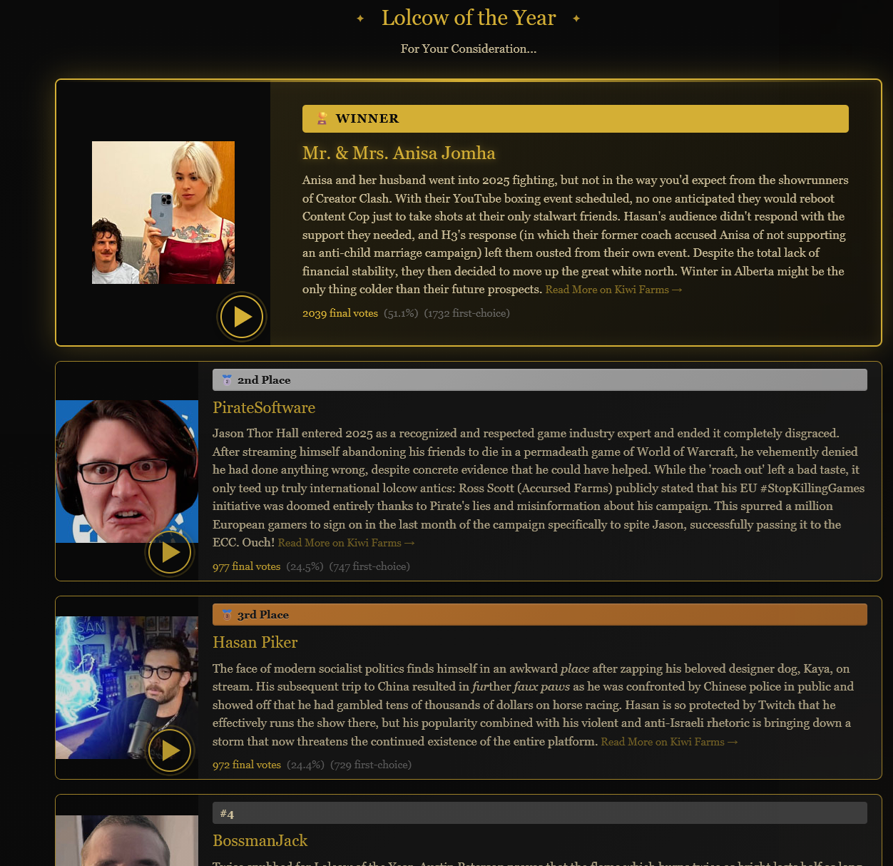 >>732317427I mean Anisa did play a part in Ian's downfall, but the person who ultimately fucked Ian's career was himself. The biggest fuckup for Ian was ripping a page from Leafy's book by backstabbing Ethan, even though he literally called Leafy out on this from that Content Cop video. What's worse is that unlike Leafy and Keemstar's friendship, Ethan was Ian's friend for all those years, despite Ian's coping that they weren't, and he was constantly supporting Ian through everything, from the OF/Cuck drama to being one of Creator Clash's promoters. Ian essentially severed his friendship just to be an orbiter to Hasan and his retard brigade, who barely acknowledge him, and often subject him to lefty humiliation rituals.