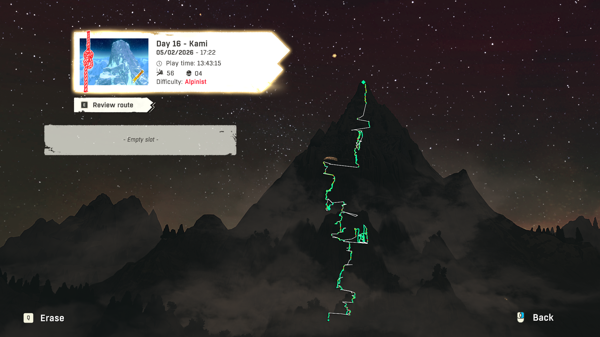 >>732333120What do you mean "leaked", the game is out.There are two endings, you can go back home before the final stretch, during the credits there's a pretty happy looking picture slide of the journey back home alongside the other climber dude you meet in the game but in the last cutscene it is implied she didn't really settle what pushed her to try and escape from the world in the first place. The second ending is pushing to the summit where a trippy sequence shows her scaling further using the stars as holds and eventually turning into a shooting star herself, to me indicating as she died she felt the transcendance she was seeking. Reporting on her "success" was probably never something she gave any thought to and is certainly not the reason why she dies, nor was she ego-driven to be the first.