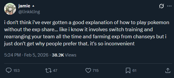 >>732331484pokemon goes from shit to abysmal dogshit without the exp share. there i said it