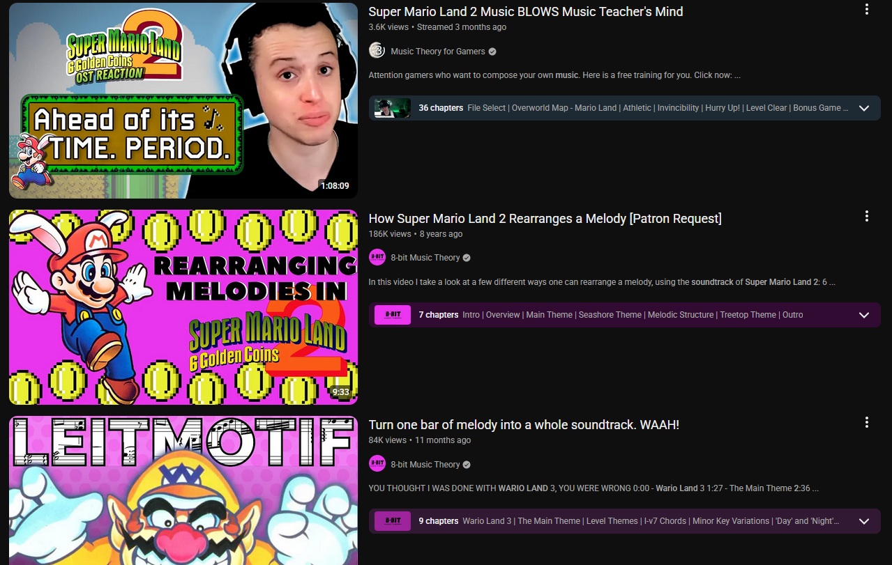 I like how this game had a great soundtrack with very varied themes and melodies, and then Mario Land 2 comes along and build its entire OST around literally one single melody so that decades later music theory youtubers could soipog over it.I hate Leitmotif overuse so much