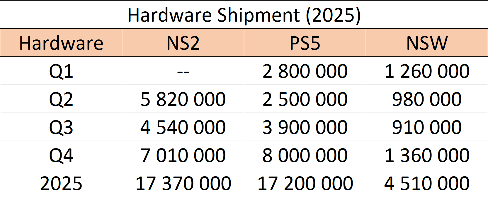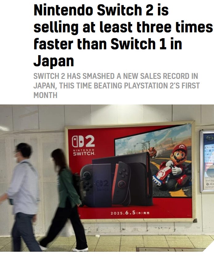 Nintendo Switch 2 is selling at least three times faster than Switch 1 in Japan>Nintendo Switch 2 has broken PS2’s first-month sales record in Japan. According to data supplied by Famitsu (reported by Yomiuri) the console has reportedly sold at least 1.5 million units in Japan during its first month. It’s worth noting, as highlighted by Katan Games’ Dr. Serkan Toto, this doesn’t include units sold by Nintendo themselves; therefore, the number is likely much higher.>The Switch 2’s sales figure indicates it’s selling at least three times faster than the original Switch in Japan, which managed 556,633 units during the same period. The best first-month sales for a non-Nintendo system was 1,134,862 units, which the PS2 managed in 2000.>Nintendo Switch 2 sold 3.5 million units globally in its first four days on sale, the company said, making it the fastest-selling Nintendo system ever, and likely the biggest ever console launch. If Switch 2 surpasses 15 million units in its opening year, it will beat what the original Switch managed. PlayStation 4 and PlayStation 5 launched later in the year, and sold around 7.5 million units each.
