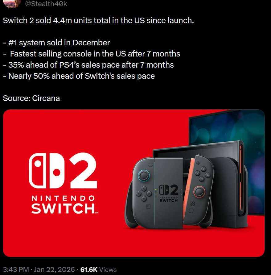this figure places the Switch 2 ahead of the PlayStation 4’s record of 2.2 million units sold during a similar timeframe, officially making it the fastest-selling video game console in U.S. history.> The Nintendo Switch 2 was credited for offsetting steep declines in sales of other major platforms, including the PlayStation 5, Xbox Series consoles, and the original Switch. Moreover, Piscatella noted that the Switch 2’s performance is 77 percent higher than the time-aligned sales of the first Nintendo Switch, underscoring the strong consumer demand surrounding the system’s launch.>“With 2.4M units sold LTD over its first 3 months market, Nintendo Switch 2 is now 5% ahead of the previous record setting pace of PlayStation 4, which sold 2.2M units during the 3 months ending January 2014.” >The remarkable launch of the Switch 2 further reinforces Nintendo’s ongoing dominance in the console market. With demand continuing to outpace supply in some regions, and a growing library of first-party and third-party titles, the console appears well-positioned to sustain its momentum through the holiday season.