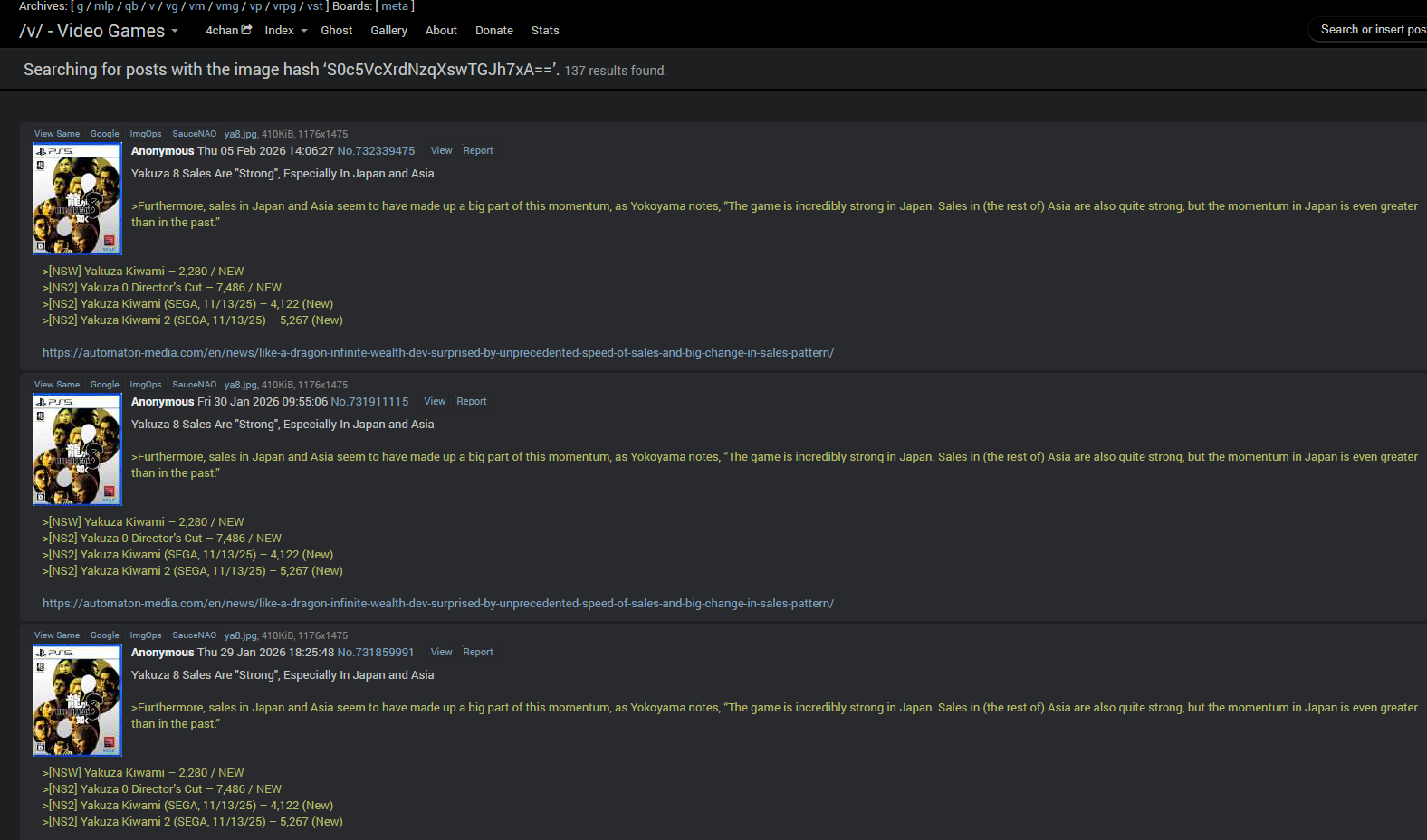 Yakuza 8 Sales Are "Strong", Especially In Japan and Asia>Furthermore, sales in Japan and Asia seem to have made up a big part of this momentum, as Yokoyama notes, “The game is incredibly strong in Japan. Sales in (the rest of) Asia are also quite strong, but the momentum in Japan is even greater than in the past.” >[NSW] Yakuza Kiwami – 2,280 / NEW>[NS2] Yakuza 0 Director’s Cut – 7,486 / NEW>[NS2] Yakuza Kiwami (SEGA, 11/13/25) – 4,122 (New)>[NS2] Yakuza Kiwami 2 (SEGA, 11/13/25) – 5,267 (New)https://automaton-media.com/en/news/like-a-dragon-infinite-wealth-dev-surprised-by-unprecedented-speed-of-sales-and-big-change-in-sales-pattern/